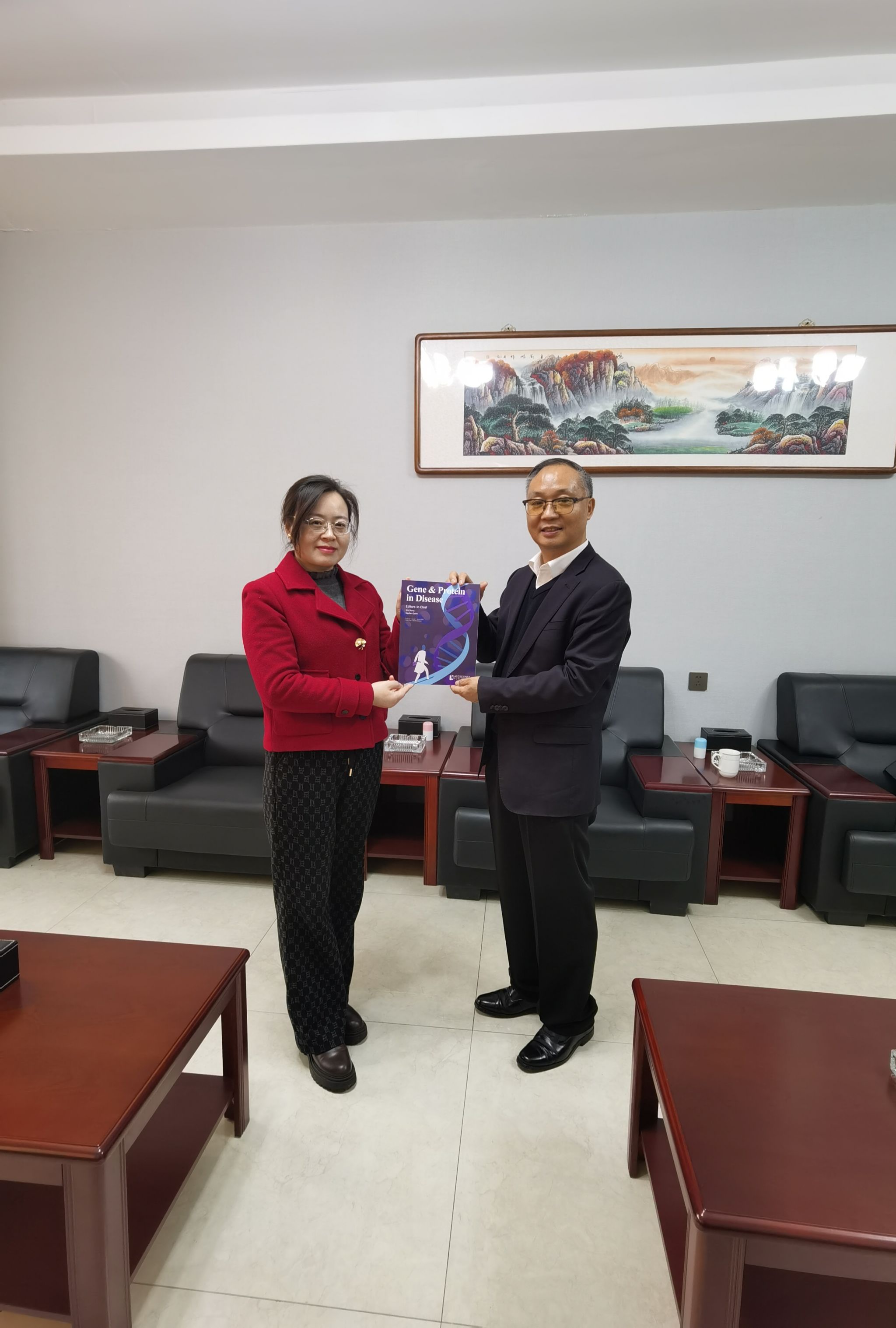 国际英文期刊Gene and Protein in Disease(GPD)创刊人和副主编姬新颖教授向山西晋中健康学院理事长黄荷女士、山西建投集团法律总顾问张世鹏先生赠送GPD首劵首期, 促进期刊推广宣传与快速发展。