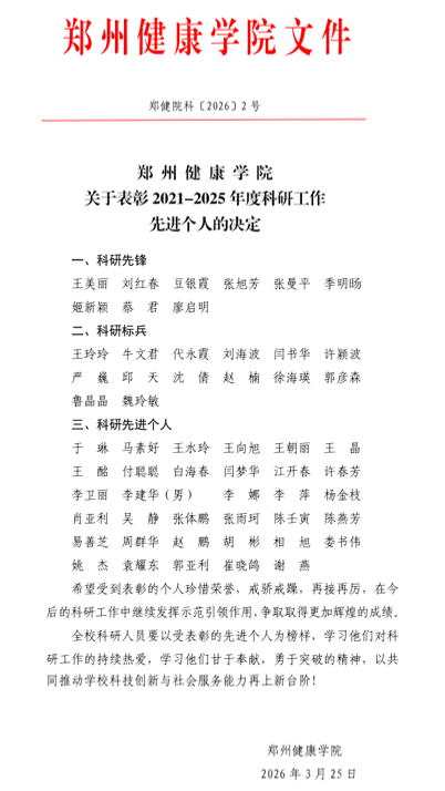 近日,我校公布 2021-2025 年(十四五期间)科研工作先进个人评选结果,河南省核蛋白医学检测工程技术研究中心多名教师凭借扎实的科研业绩与突出的贡献成功入选,彰显了研究中心在科研创新与成果转化方面的强劲实力。